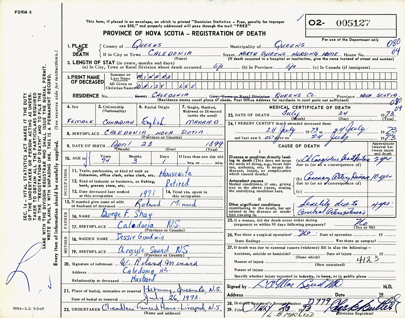Female Death Registration: Year: 1973 number: 5127