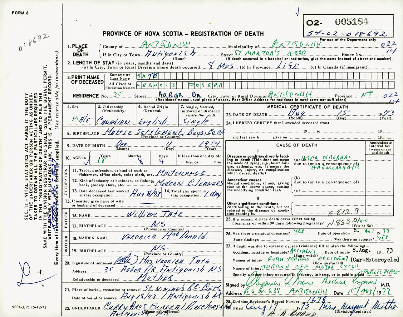 Male Death Registration: Year: 1973 number: 5184