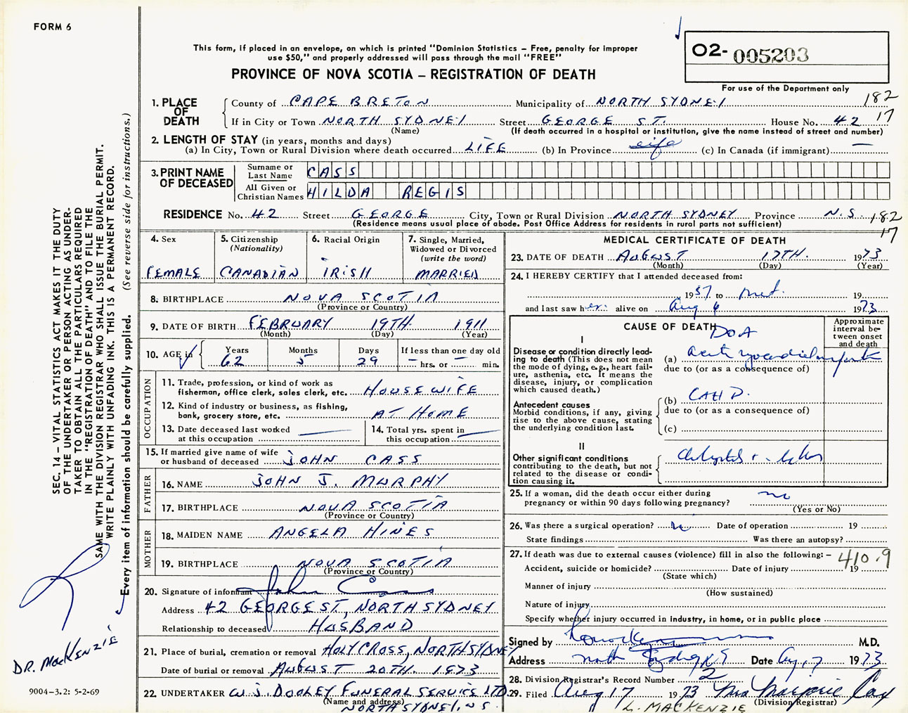 Female Death Registration: Year: 1973 number: 5203