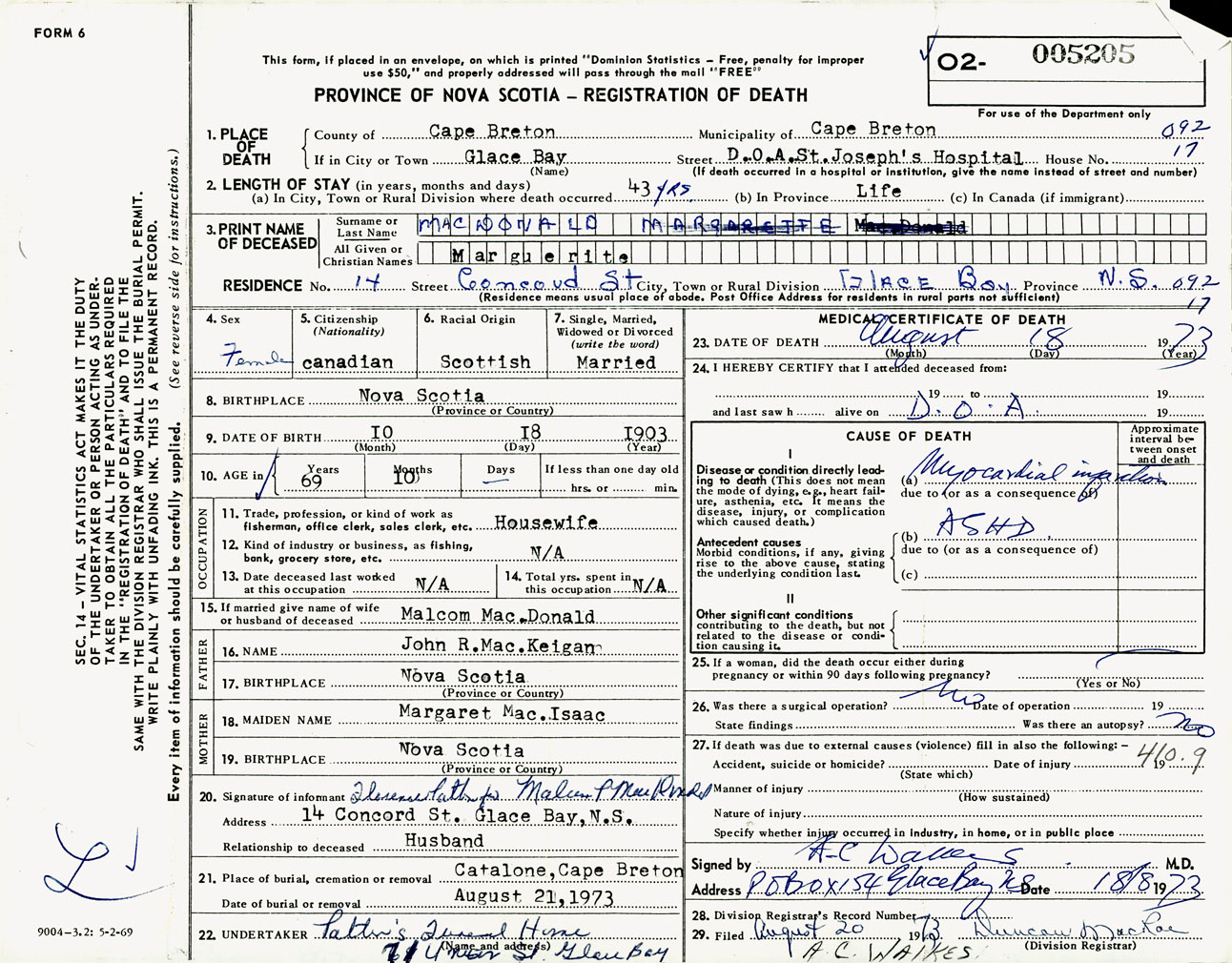 Female Death Registration: Year: 1973 number: 5205