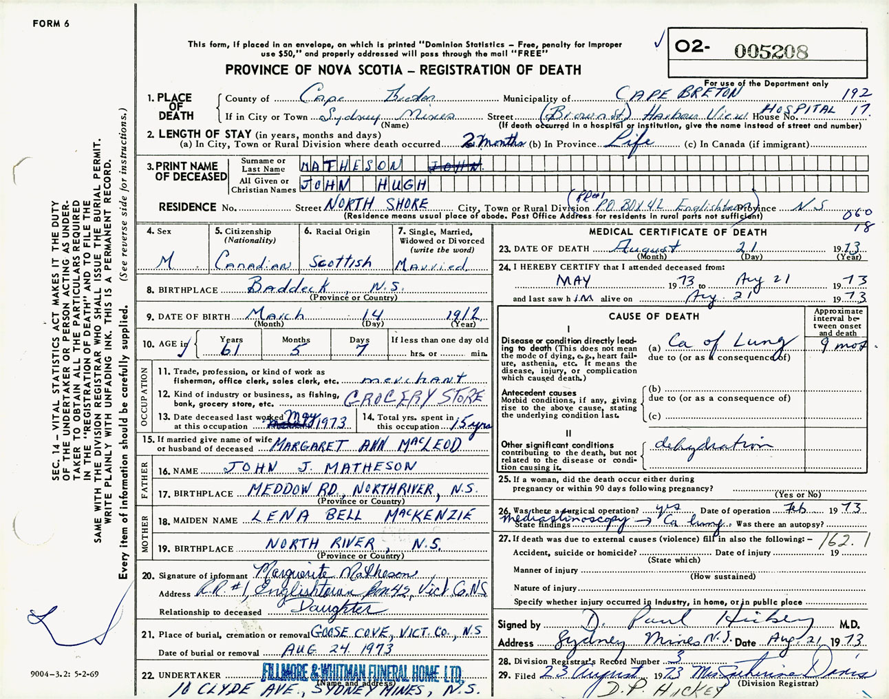 Male Death Registration: Year: 1973 number: 5208
