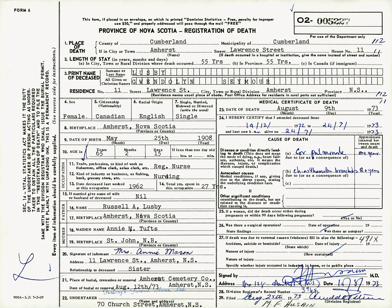 Female Death Registration: Year: 1973 number: 5227