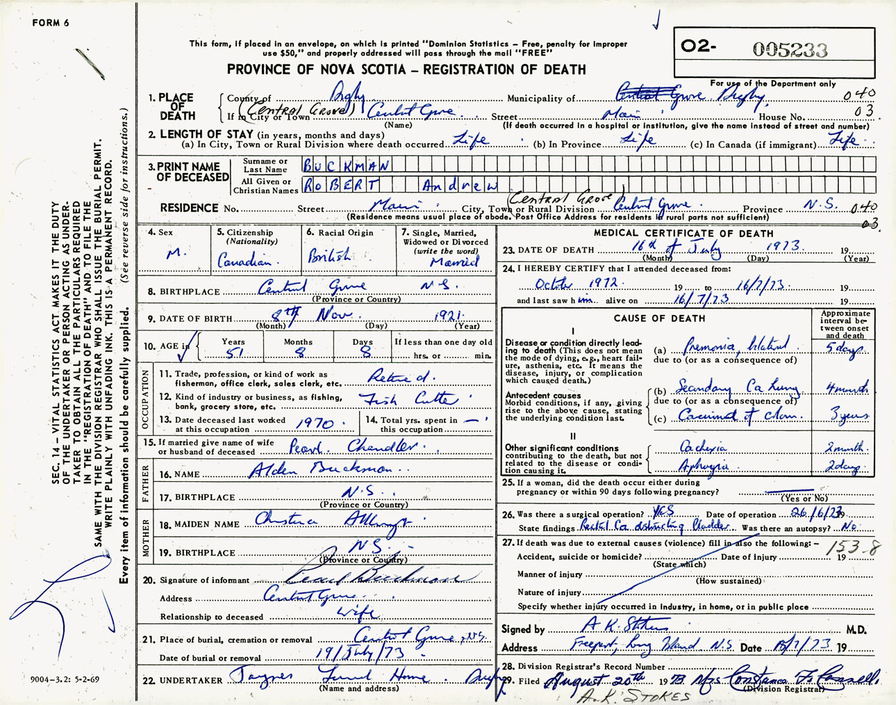 Male Death Registration: Year: 1973 number: 5233