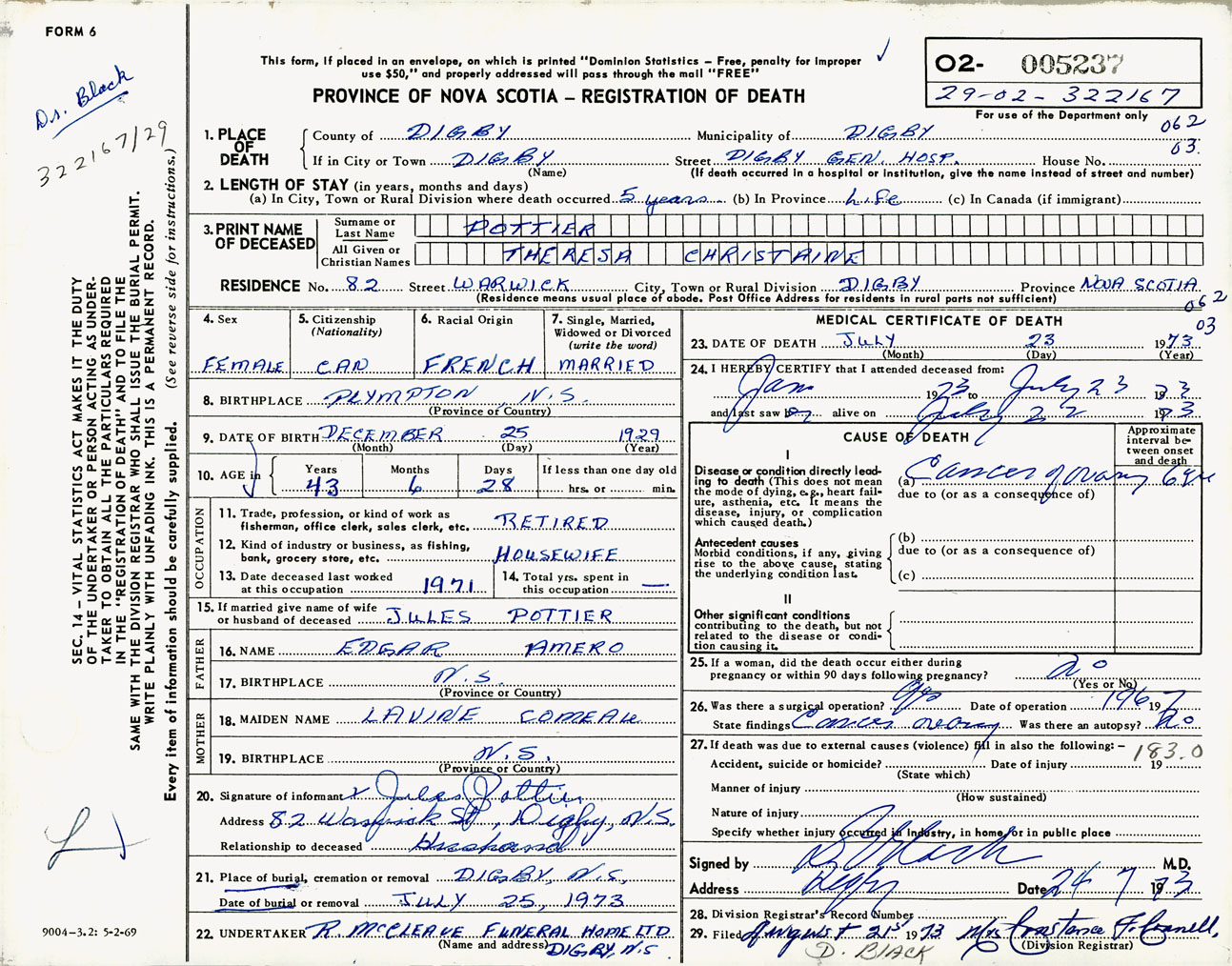 Female Death Registration: Year: 1973 number: 5237