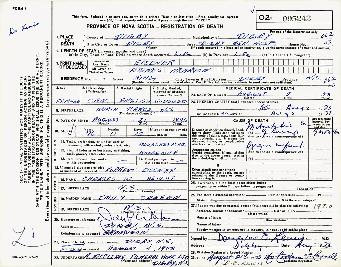 Female Death Registration: Year: 1973 number: 5242