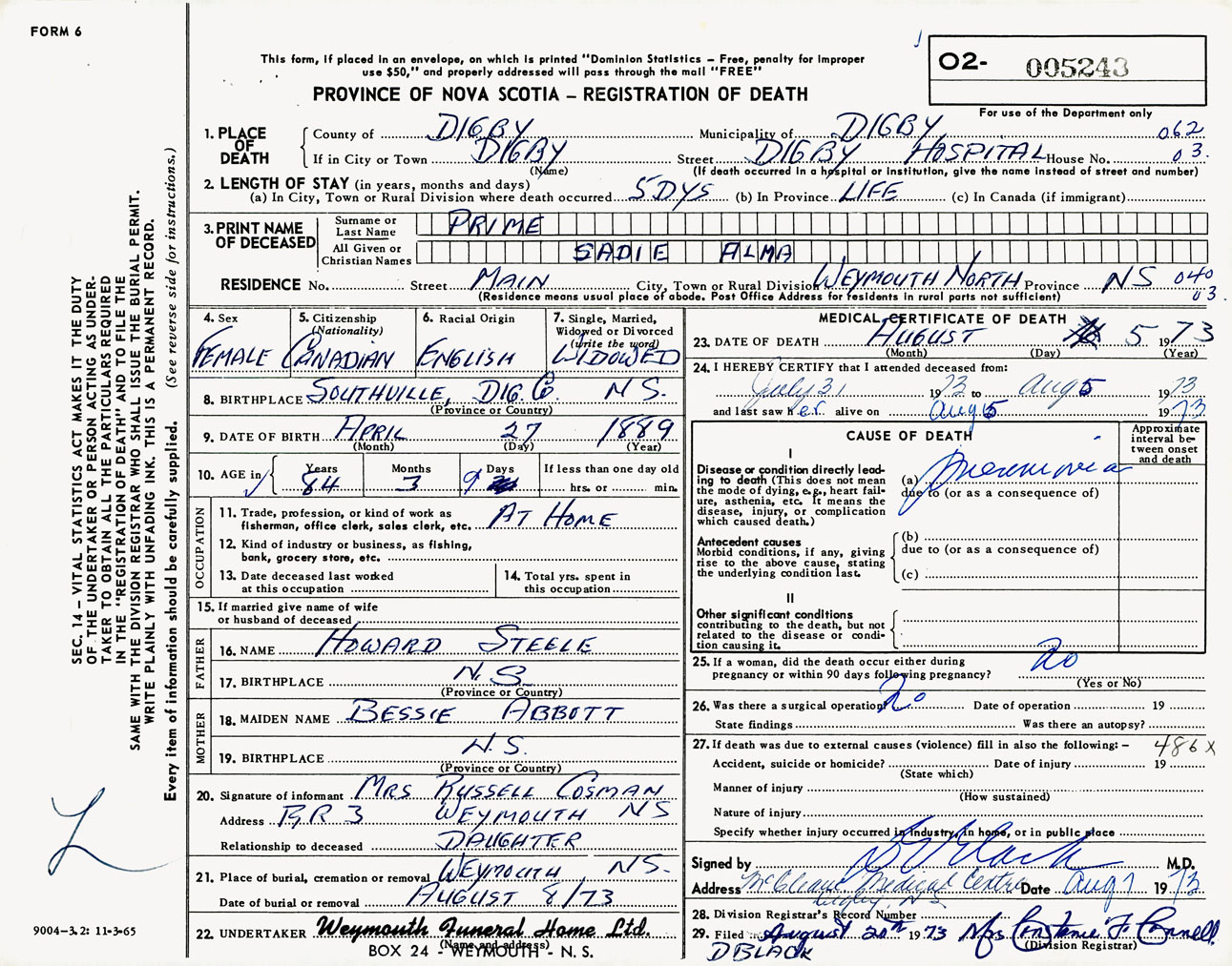 Female Death Registration: Year: 1973 number: 5243