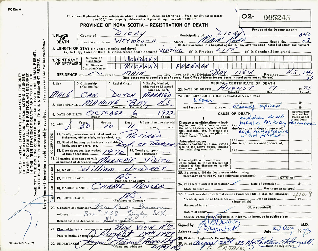 Male Death Registration: Year: 1973 number: 5245