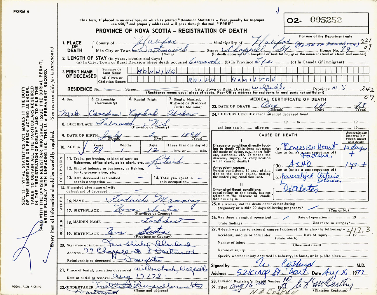 Male Death Registration: Year: 1973 number: 5252