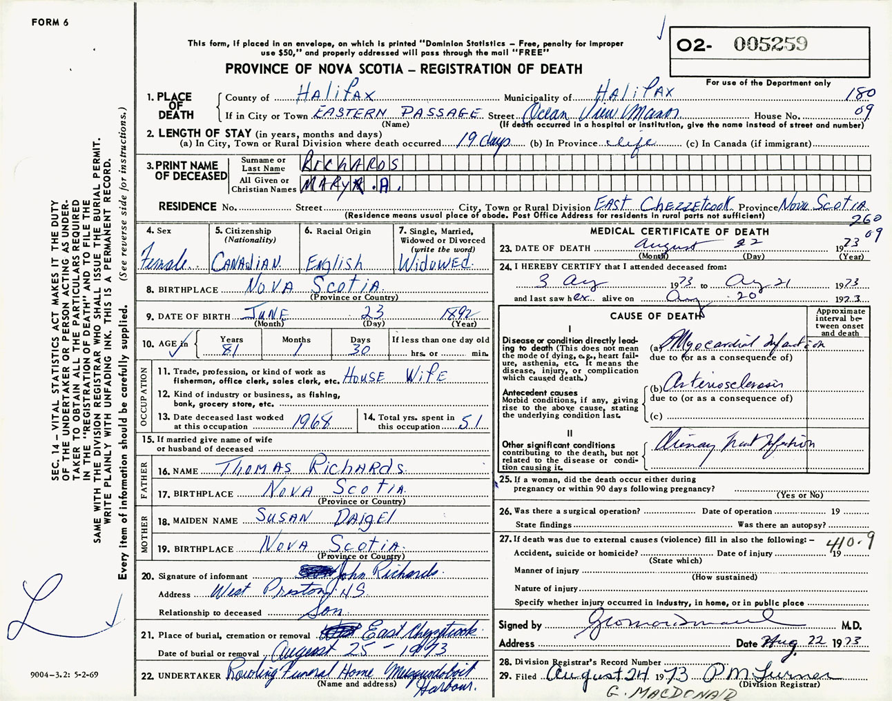 Female Death Registration: Year: 1973 number: 5259