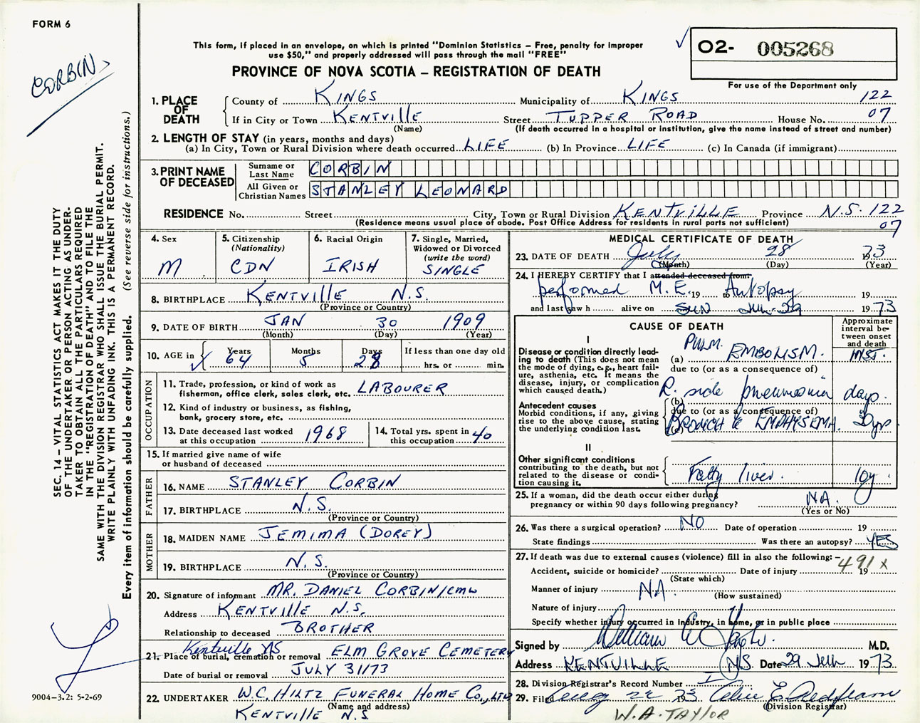 Male Death Registration: Year: 1973 number: 5268
