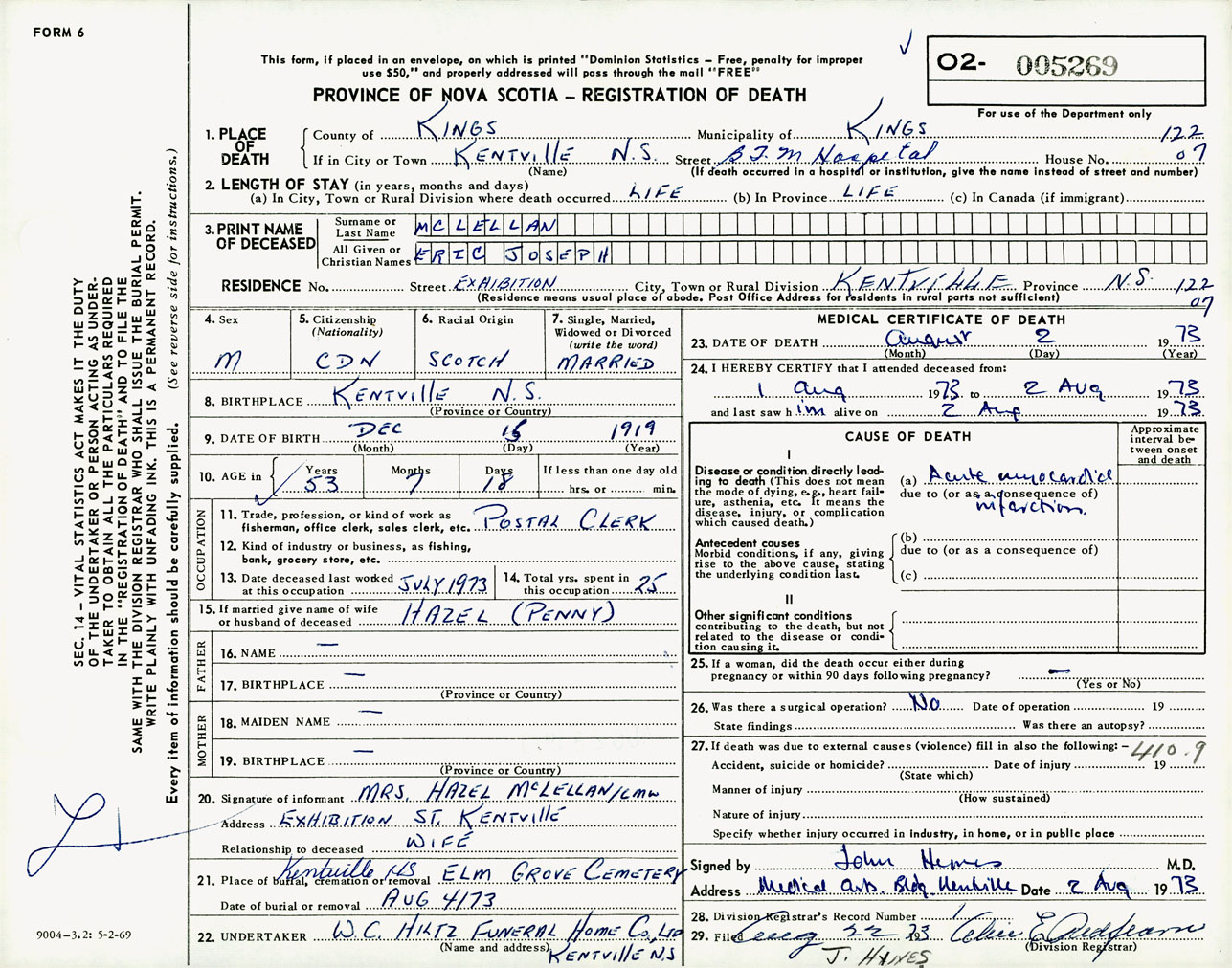 Male Death Registration: Year: 1973 number: 5269
