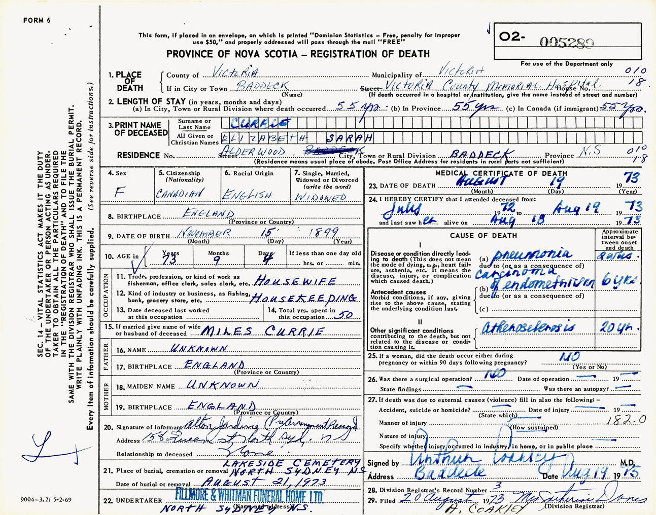 Female Death Registration: Year: 1973 number: 5289