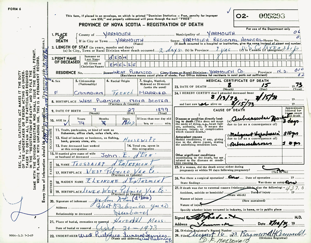 Female Death Registration: Year: 1973 number: 5293