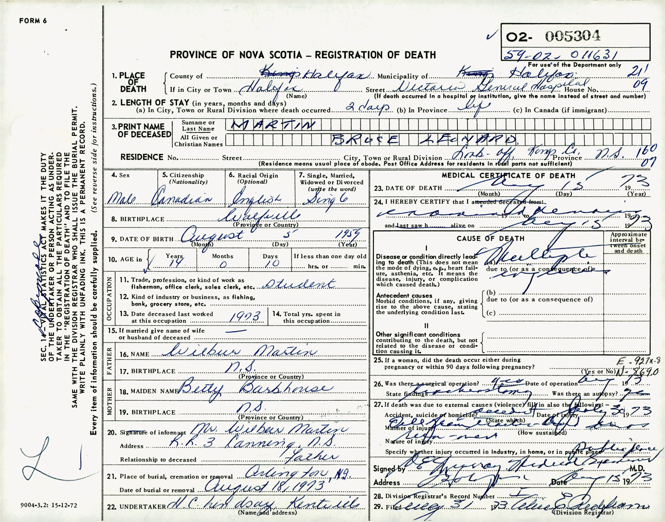 Male Death Registration: Year: 1973 number: 5304