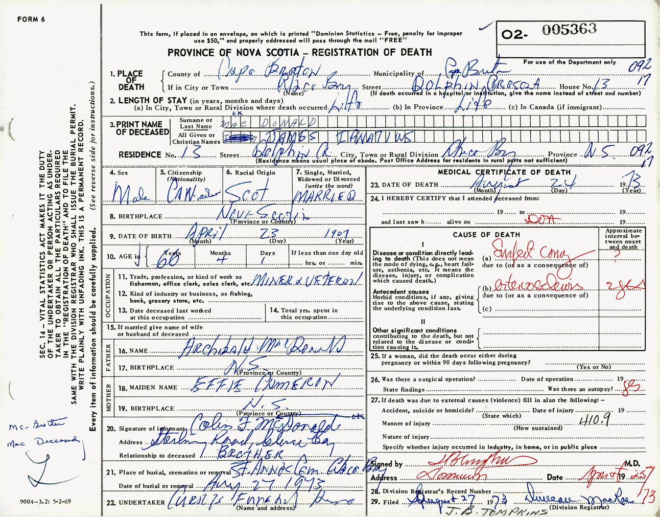 Male Death Registration: Year: 1973 number: 5363