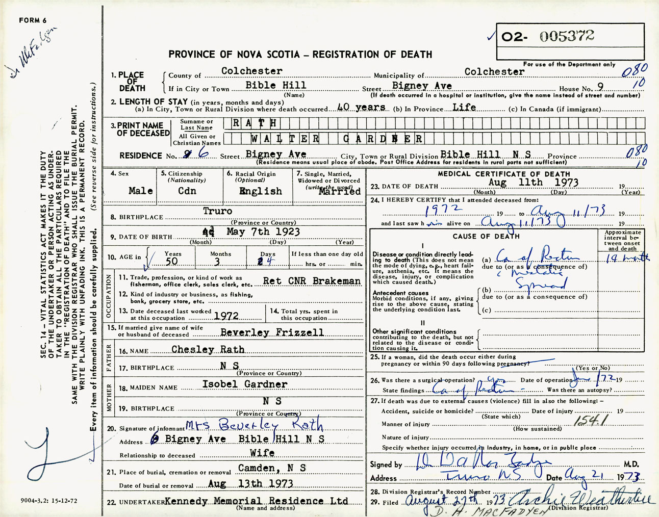 Male Death Registration: Year: 1973 number: 5372