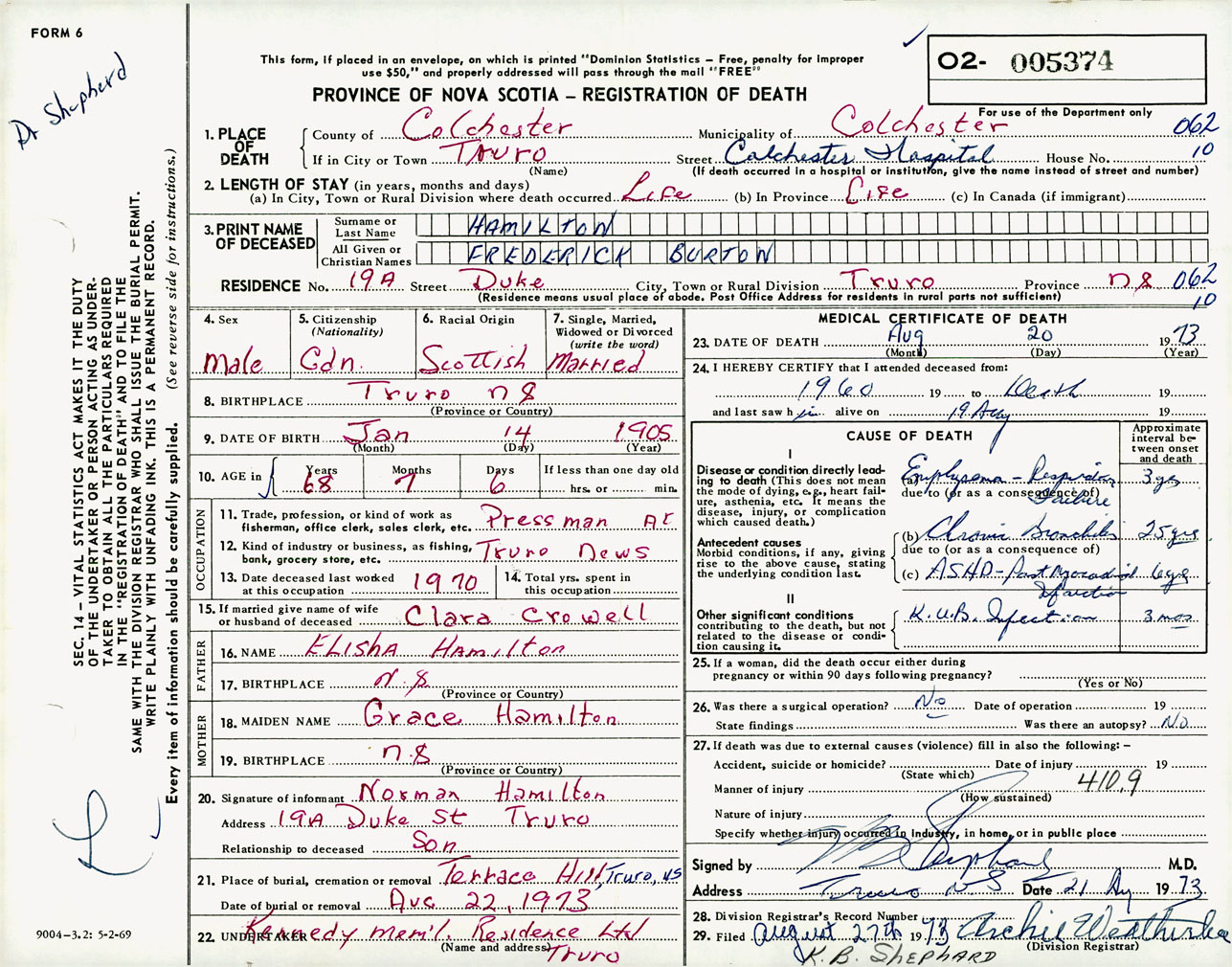 Male Death Registration: Year: 1973 number: 5374