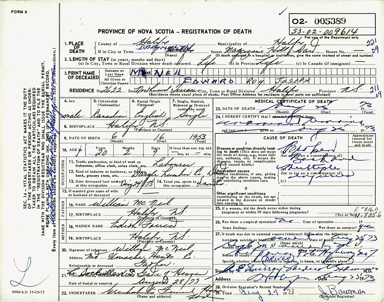 Male Death Registration: Year: 1973 number: 5389