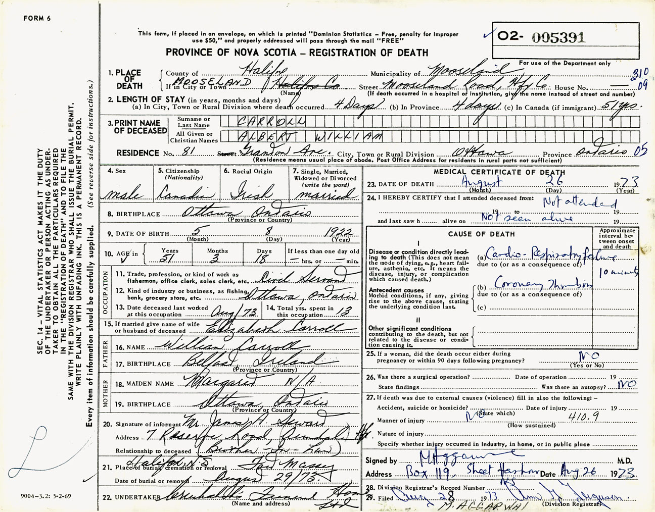 Male Death Registration: Year: 1973 number: 5391