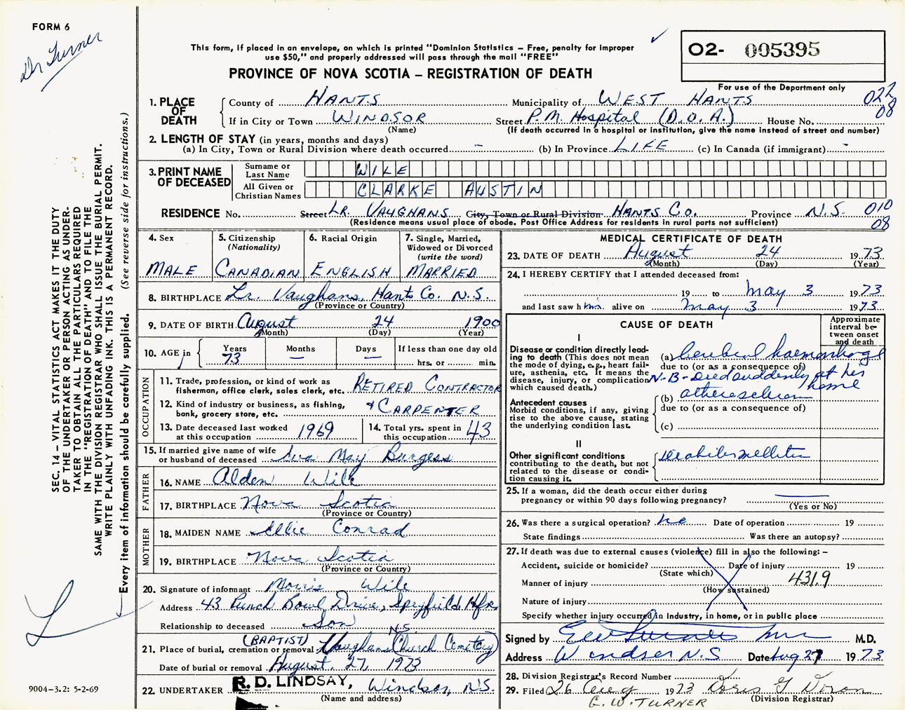 Male Death Registration: Year: 1973 number: 5395