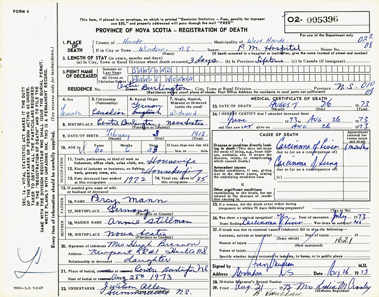 Female Death Registration: Year: 1973 number: 5396