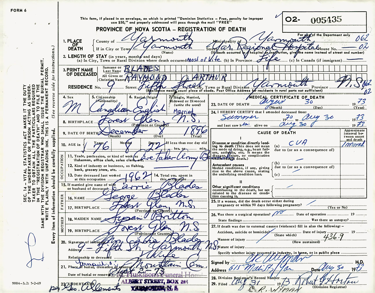 Male Death Registration: Year: 1973 number: 5435