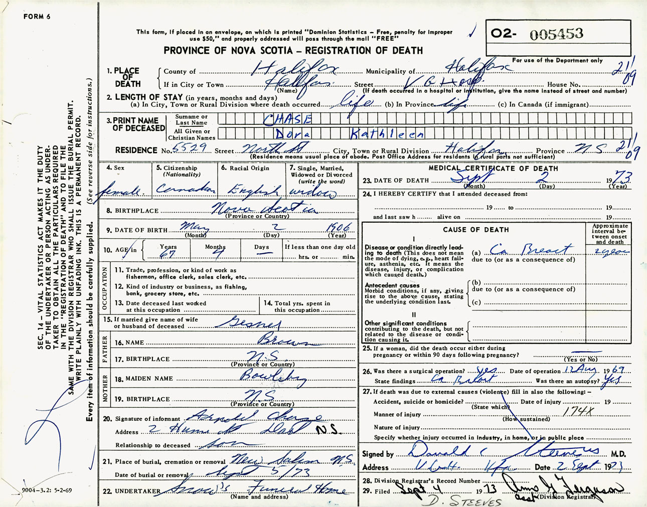 Female Death Registration: Year: 1973 number: 5453
