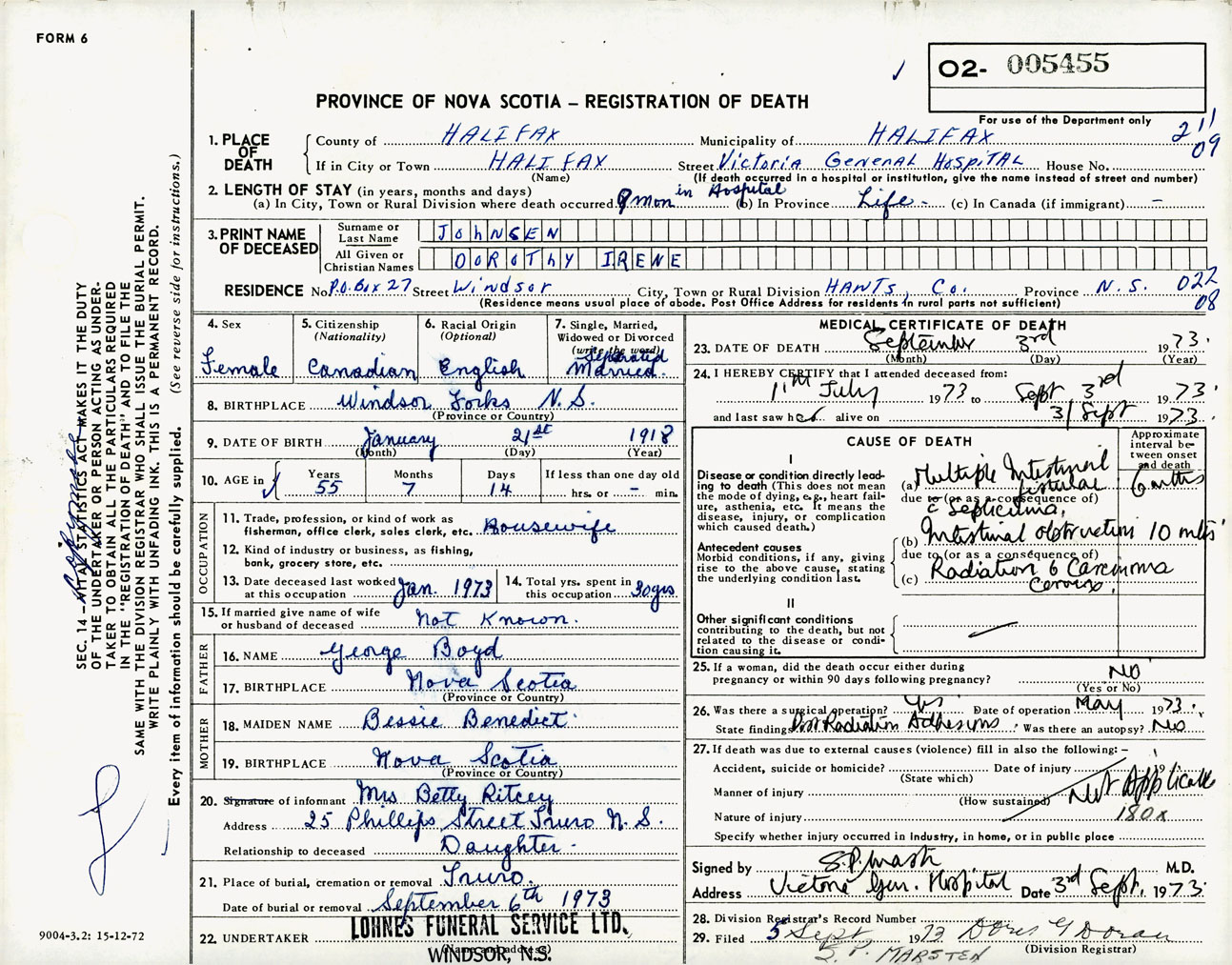 Female Death Registration: Year: 1973 number: 5455