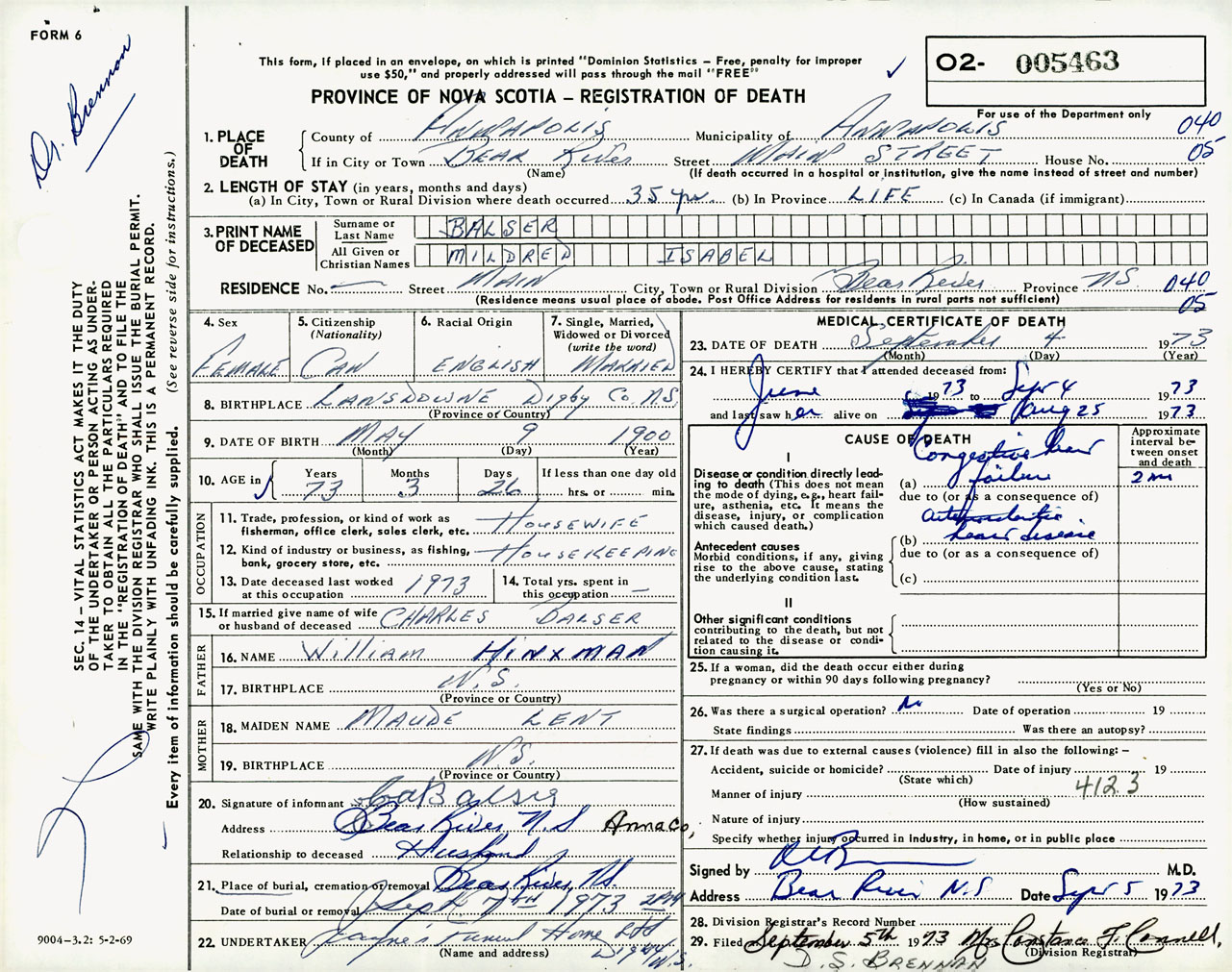 Female Death Registration: Year: 1973 number: 5463