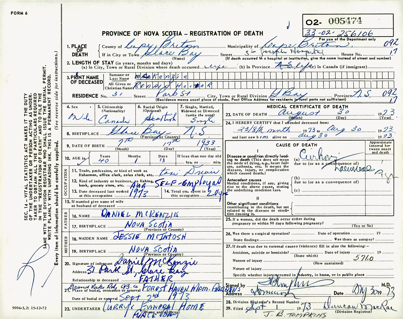 Male Death Registration: Year: 1973 number: 5474