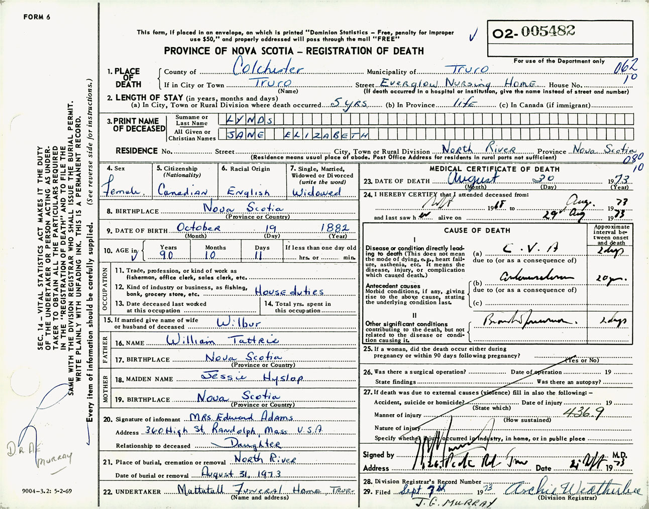 Female Death Registration: Year: 1973 number: 5482