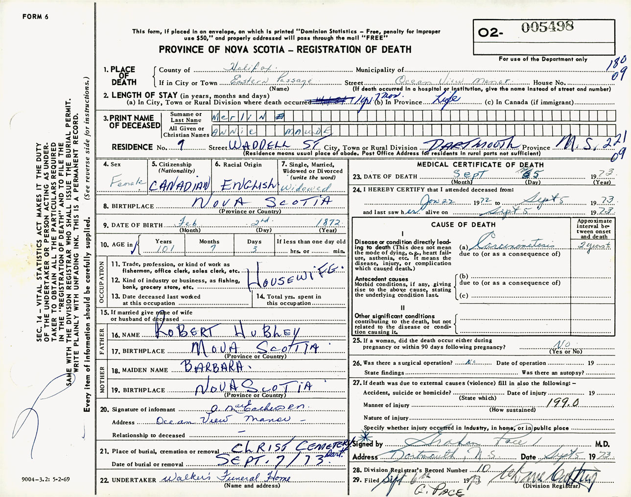 Female Death Registration: Year: 1973 number: 5498
