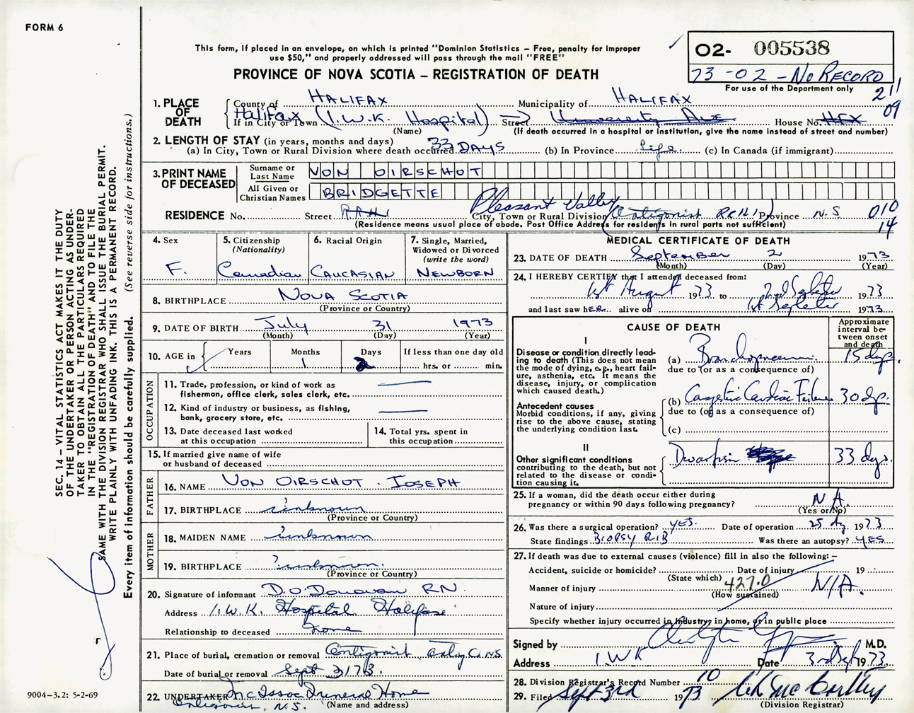 Female Death Registration: Year: 1973 number: 5538