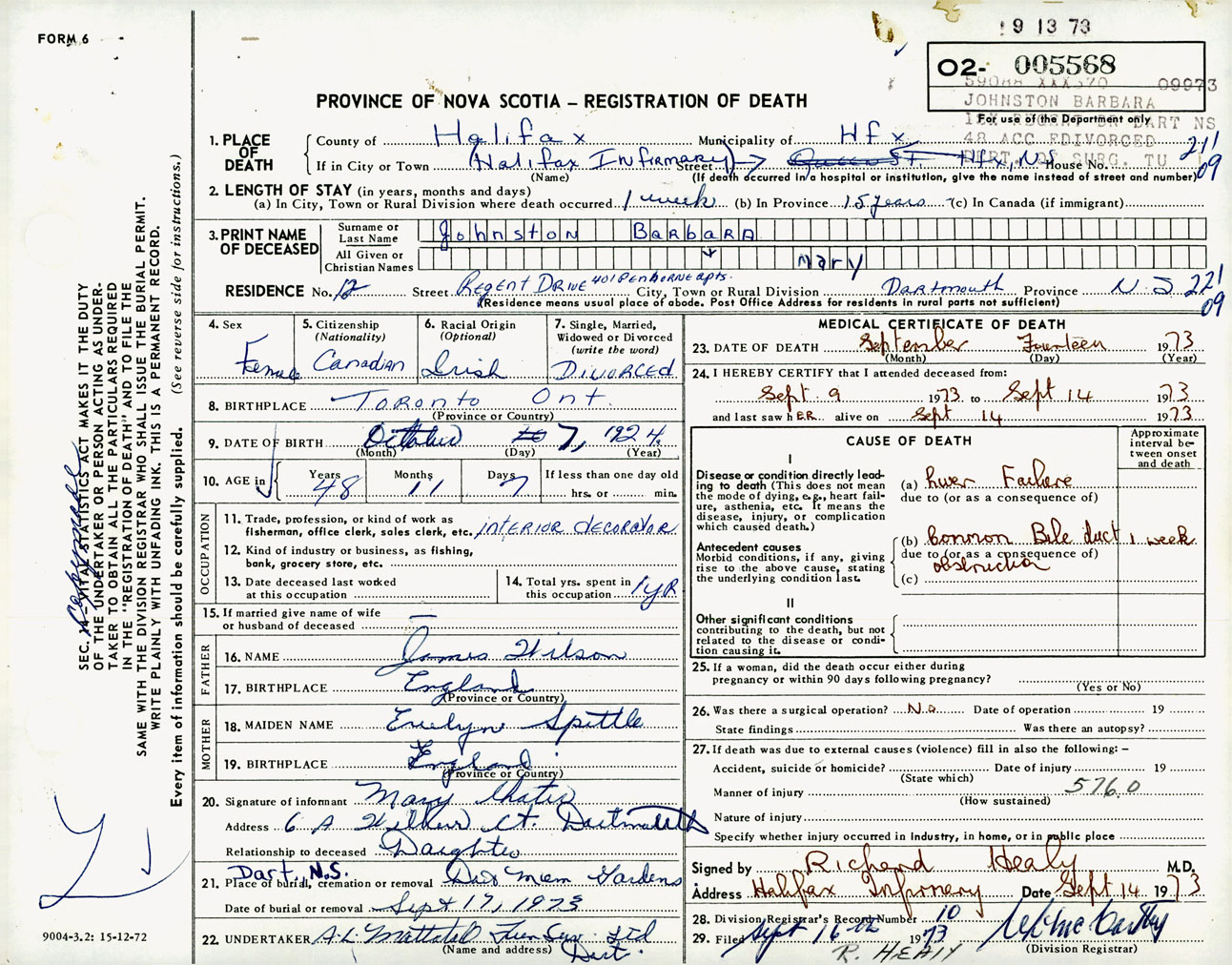 Female Death Registration: Year: 1973 number: 5568