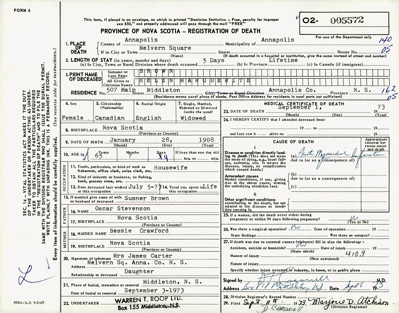 Female Death Registration: Year: 1973 number: 5572