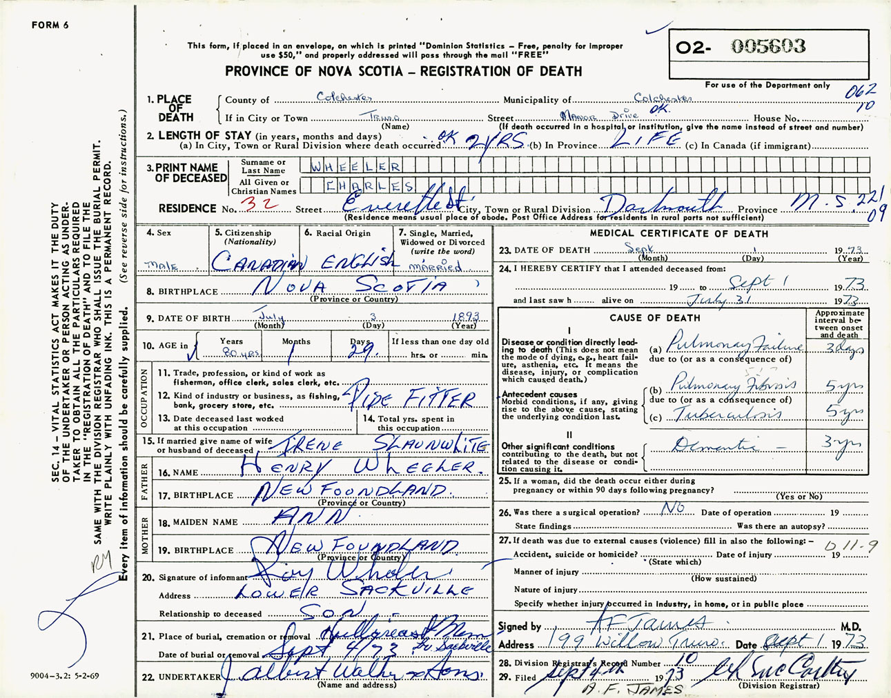 Male Death Registration: Year: 1973 number: 5603