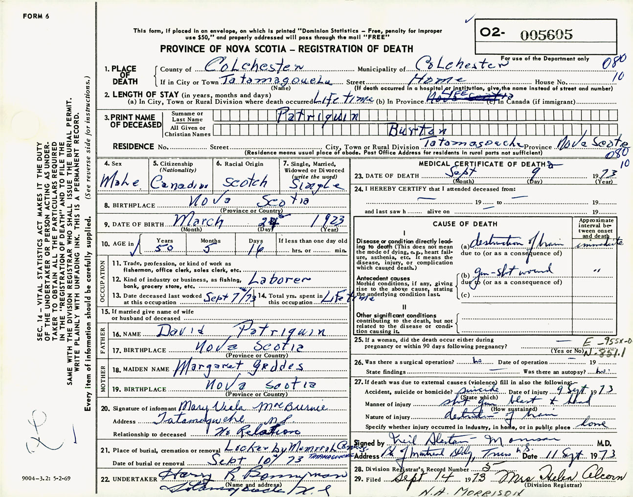 Male Death Registration: Year: 1973 number: 5605