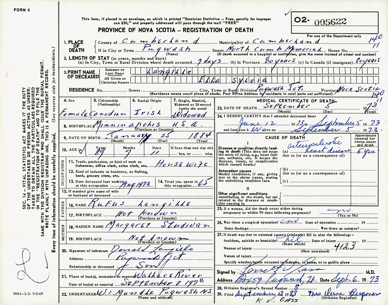 Female Death Registration: Year: 1973 number: 5622