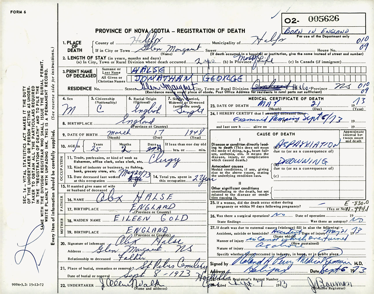 Male Death Registration: Year: 1973 number: 5626