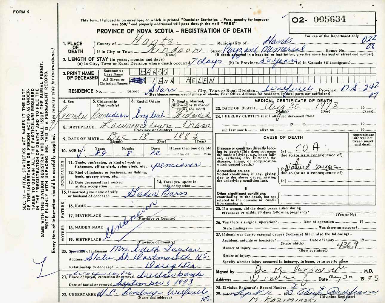 Female Death Registration: Year: 1973 number: 5634