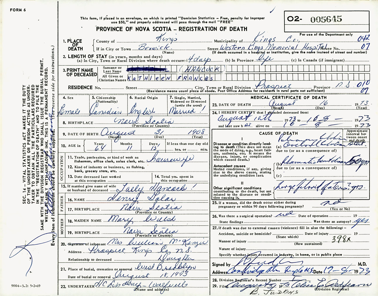 Female Death Registration: Year: 1973 number: 5645