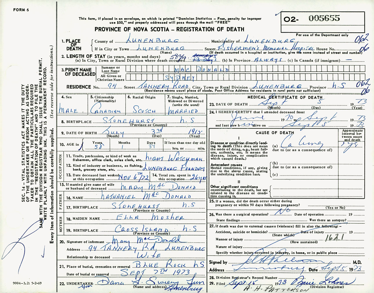 Male Death Registration: Year: 1973 number: 5655