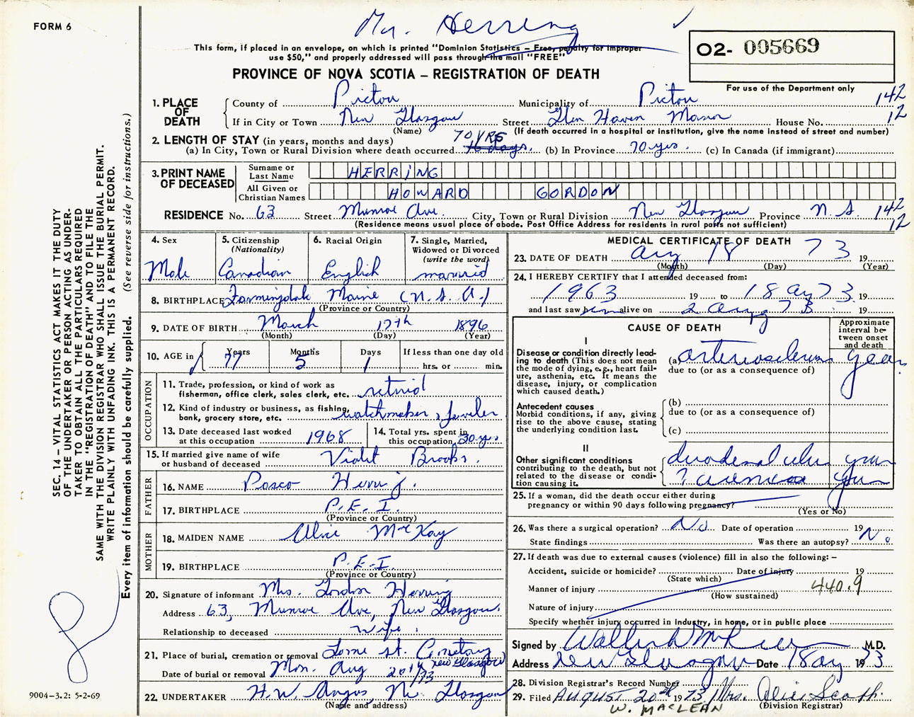 Male Death Registration: Year: 1973 number: 5669
