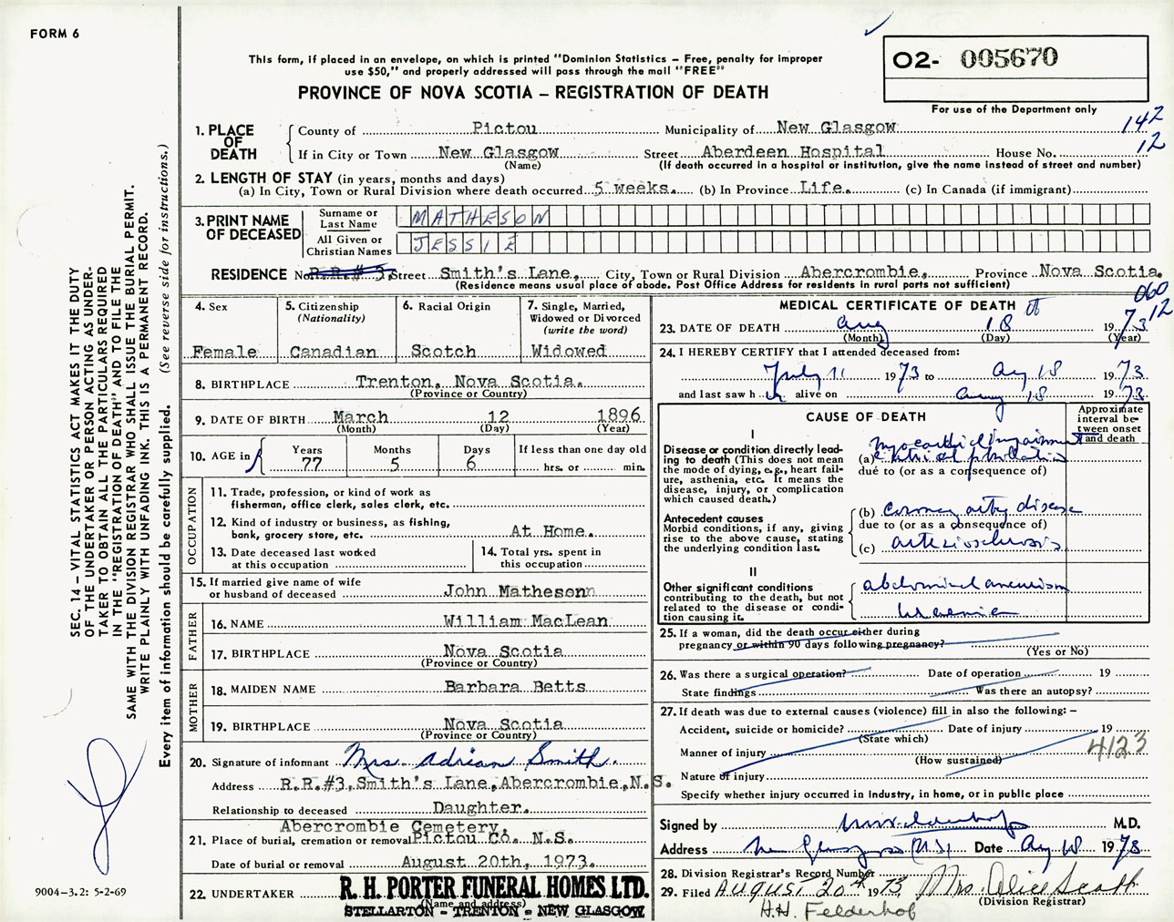 Female Death Registration: Year: 1973 number: 5670