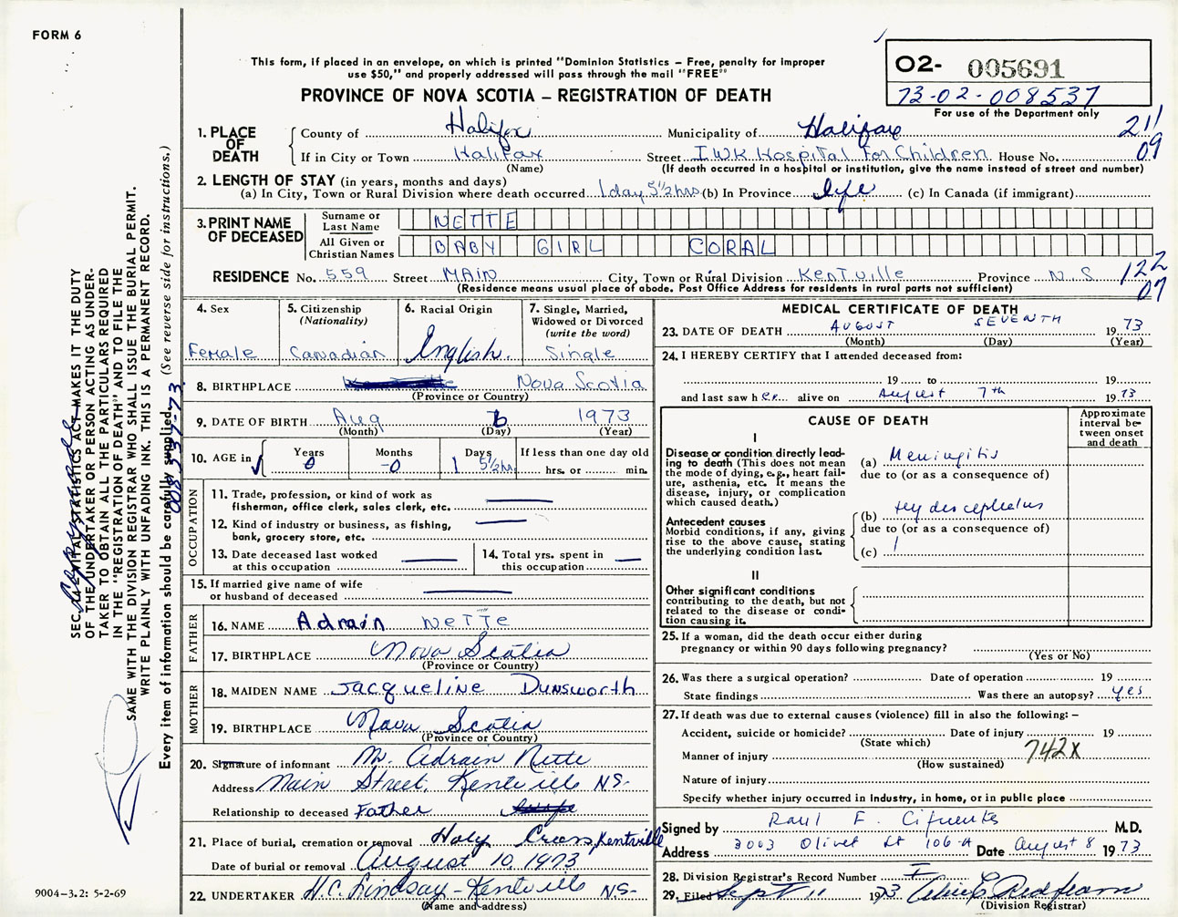 Female Death Registration: Year: 1973 number: 5691