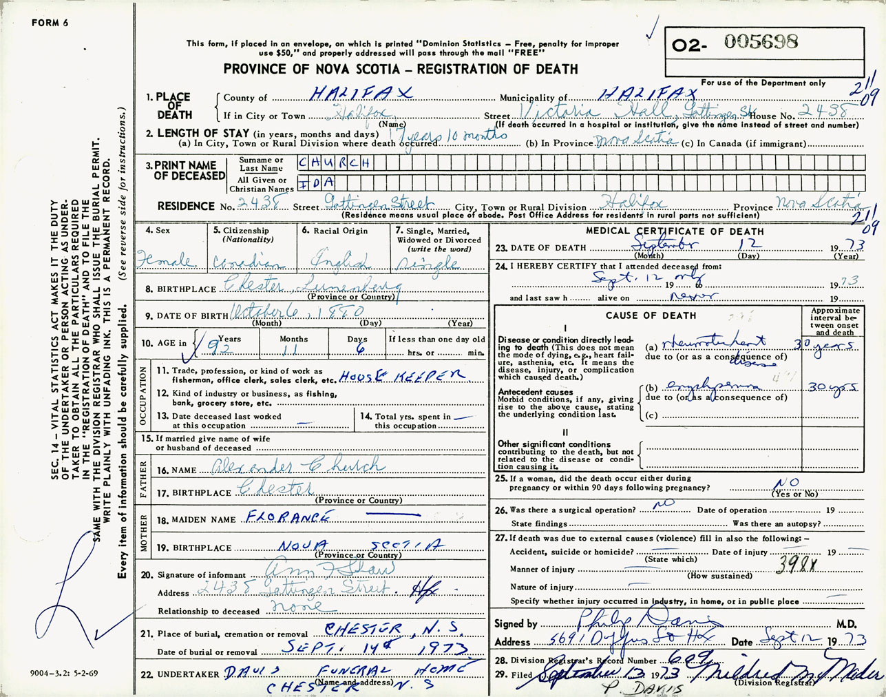 Female Death Registration: Year: 1973 number: 5698