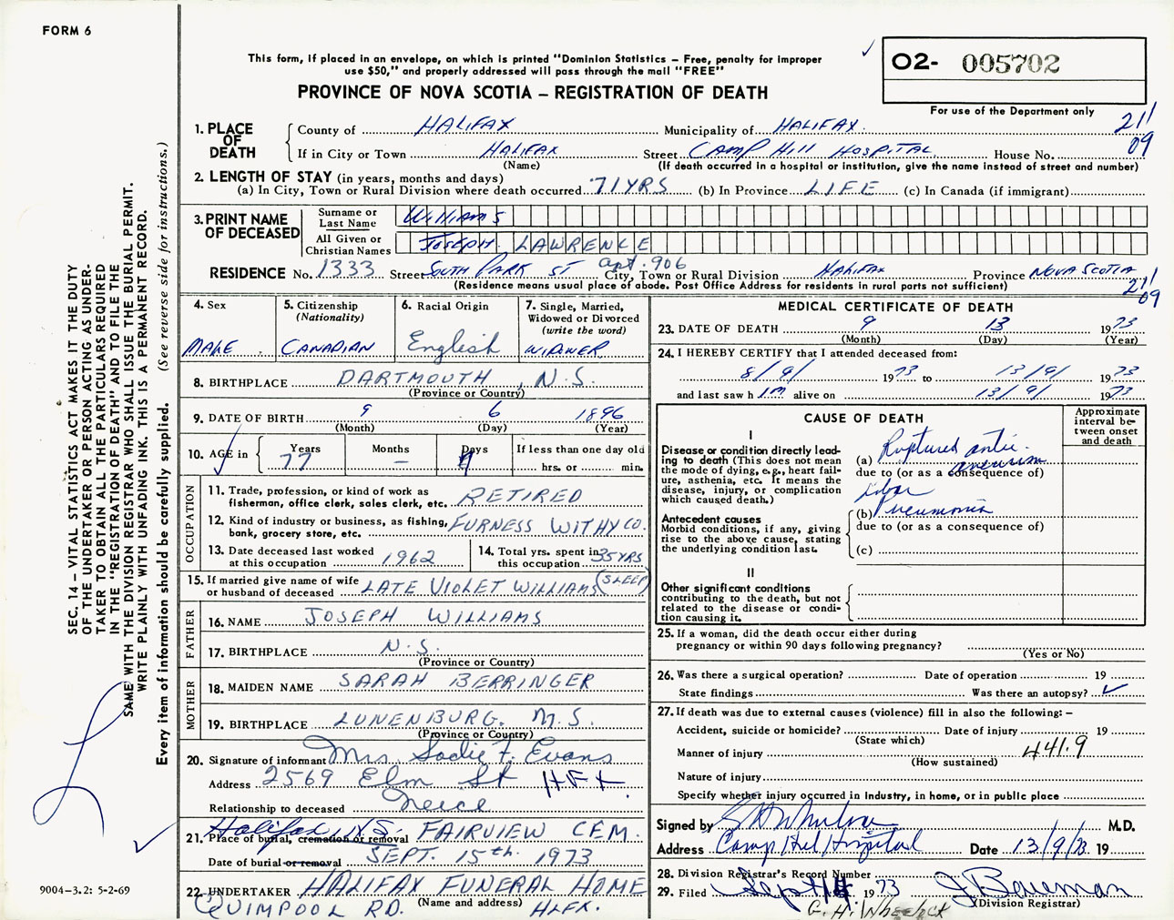 Male Death Registration: Year: 1973 number: 5702