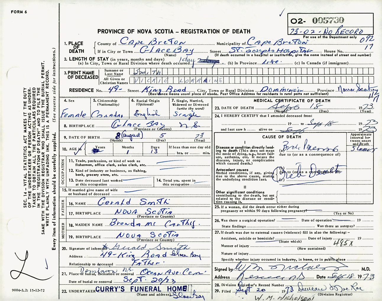Female Death Registration: Year: 1973 number: 5730