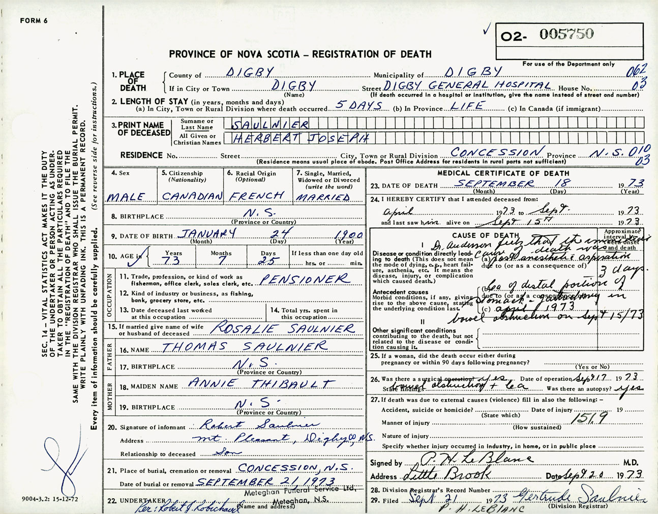 Male Death Registration: Year: 1973 number: 5750