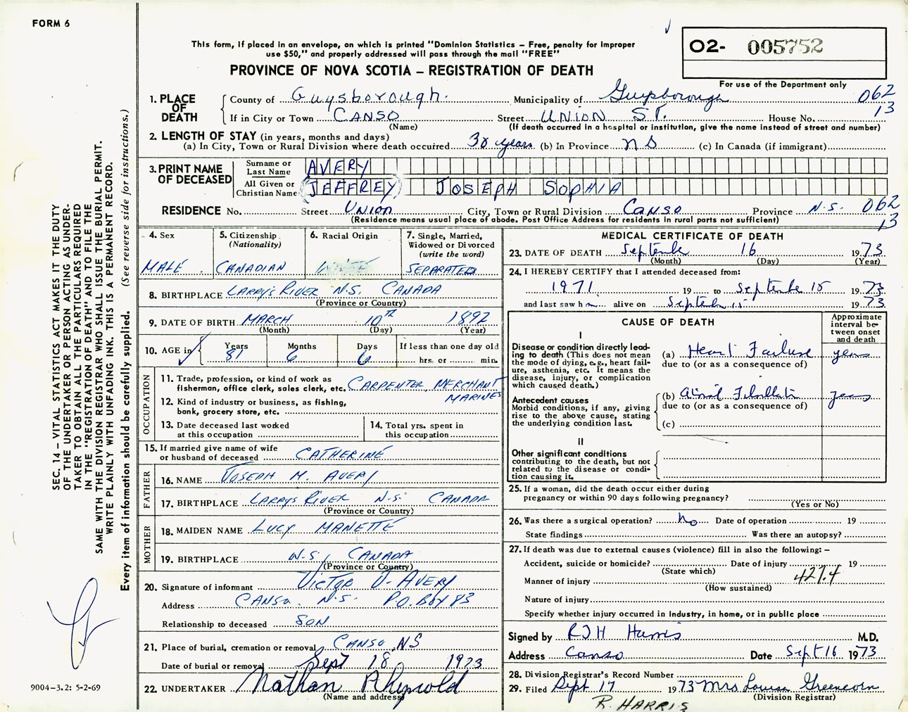 Male Death Registration: Year: 1973 number: 5752